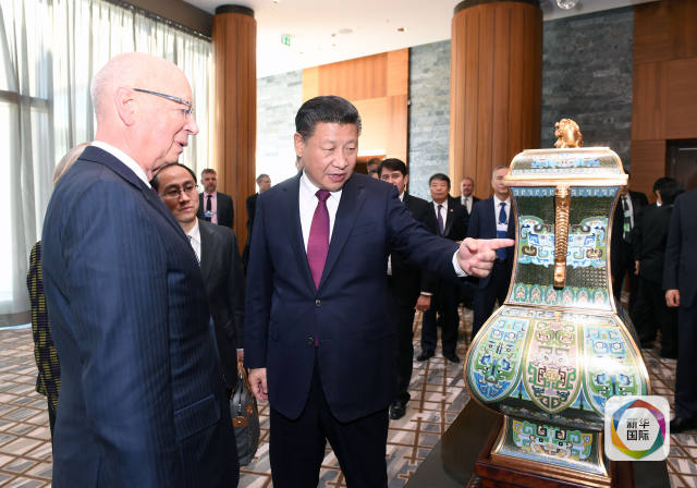 1月17日,國家主席習(xí)近平在瑞士達(dá)沃斯會見世界經(jīng)濟(jì)論壇主席施瓦布。這是習(xí)近平向施瓦布介紹中華人民共和國贈送給世界經(jīng)濟(jì)論壇的四面方尊。(新華社記者 饒愛民 攝)