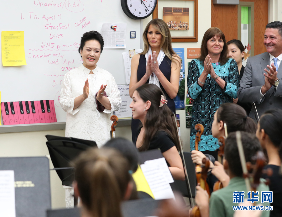 彭麗媛抵達(dá)時,梅拉尼婭和棕櫚灘郡學(xué)區(qū)長阿沃莎、巴克藝術(shù)中學(xué)校長羅贊基等在停車處熱情迎接。彭麗媛先后參觀了聲樂教室、交響樂隊(duì)教室、弦樂教室,欣賞學(xué)生演唱和樂隊(duì)表演,并同學(xué)生們親切互動交流。隨后,彭麗媛觀摩了時政經(jīng)濟(jì)課,回答了學(xué)校小記者關(guān)于“你和藝術(shù)的淵源”的提問,并接受了學(xué)生自己創(chuàng)作的水彩畫。彭麗媛表示,中美兩國可以加強(qiáng)藝術(shù)交流合作。希望巴克藝術(shù)中學(xué)的老師和同學(xué)們以教育和藝術(shù)為橋梁,為增進(jìn)中美兩國人民友好、推動兩國關(guān)系發(fā)展作出更多貢獻(xiàn)。