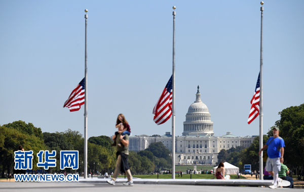 10月2日,在美國(guó)首都華盛頓,國(guó)會(huì)山附近的美國(guó)國(guó)旗降至旗桿中部。新華社記者 殷博古 攝