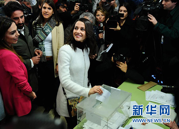12月21日,在西班牙巴塞羅那,公民黨候選人伊內(nèi)斯·阿里馬達斯(中)在一處投票站投票。新華社記者郭求達攝
