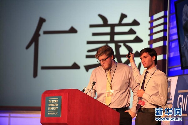 11月18日,在美國首都華盛頓的喬治·華盛頓大學,參賽選手進行中文演講。美國喬治·華盛頓大學中國學生學者聯(lián)合會和喬治·華盛頓大學孔子學院聯(lián)合主辦的第一屆“華語擂臺”漢語辯論賽18日落下帷幕。來自賓夕法尼亞州、猶他州、佛羅里達州等美國多地的10名參賽者兩兩組隊,通過成語挑戰(zhàn)、現(xiàn)場問答和團隊辯論三種形式,展示了各自的漢語知識、語言和思辨能力及個人風采。新華社記者 楊承霖 攝