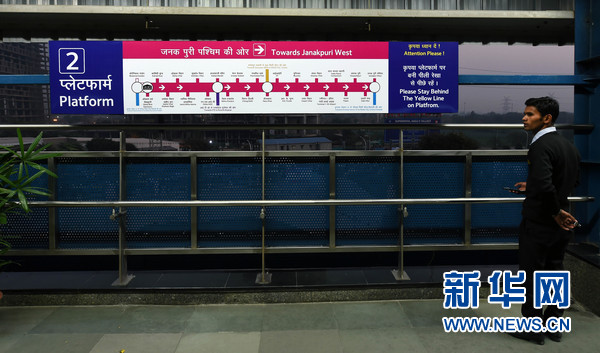 12月25日,在印度首都新德里洋紅色地鐵線,一名工作人員在站牌下職守。當(dāng)日,連接新德里及其衛(wèi)星城諾伊達(dá)(Noida)之間的洋紅色地鐵線建成通車。這條線路全長12.64公里。德里地鐵公司計劃未來提高這條地鐵線路自動化水平,以“無人值守模式”運(yùn)行。目前,新德里運(yùn)營地鐵線路共有7條,分別用顏色命名,包括紅色、黃色、藍(lán)色、綠色、橙色、紫羅蘭和洋紅色。新華網(wǎng)發(fā) (張迺杰 攝)
