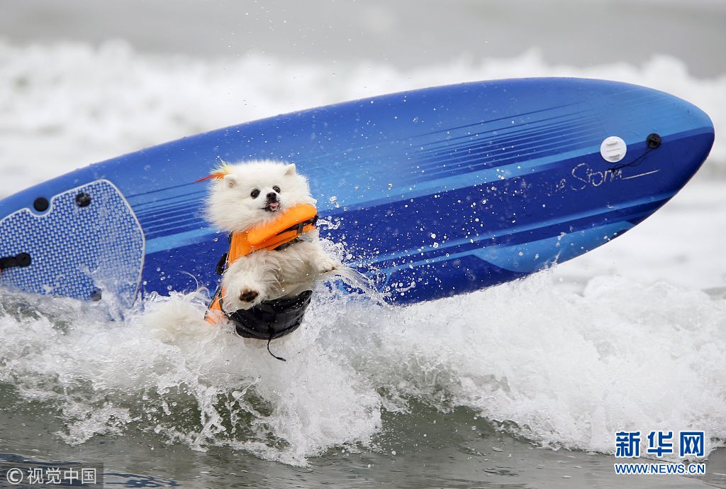 當(dāng)?shù)貢r(shí)間2015年8月1日,美國(guó)加利福尼亞州因皮里爾灘舉辦第十屆狗狗沖浪比賽,可愛“汪星人”海浪中展開激烈角逐。(圖片來源:視覺中國(guó))