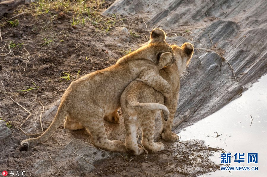 1月2日?qǐng)?bào)道(具體拍攝時(shí)間不詳),肯尼亞馬賽馬拉國(guó)家保護(hù)區(qū),64歲的攝影師Ingo Gelach在當(dāng)?shù)嘏臄z到一組有趣又暖心的照片。畫面中,兩頭小獅子站在水邊,似乎正考慮跨越面前的水域。其中一頭獅子用前腳搭在同伴的肩膀上,似乎在表達(dá)友好,又似是在鼓勵(lì)同伴不要害怕,勇敢地跨過去。(圖片來源:東方IC)