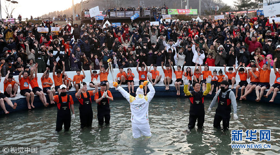 韓國奧運(yùn)圣火傳遞在鱒魚慶典場地舉行 火炬手嘴含活魚拍照