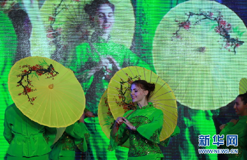 1月23日,烏克蘭基輔第一東方語言學(xué)校的學(xué)生表演傘舞。新華網(wǎng)發(fā)(陳俊鋒攝)