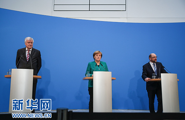 ??? 2月7日,在德國柏林的基民盟總部,德國總理、聯(lián)盟黨領(lǐng)導(dǎo)人默克爾(中),社會民主黨主席舒爾茨(右)和基社盟主席澤霍費(fèi)爾出席新聞發(fā)布會。據(jù)德國媒體報(bào)道,德國聯(lián)盟黨(由基民盟和基社盟組成)和社會民主黨(社民黨)7日就聯(lián)合組閣協(xié)議達(dá)成一致。 新華社記者單宇琦攝