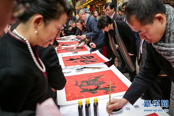 2月11日,在日本橫濱,書法家在活動現(xiàn)場寫“?!弊?。新華社記者馬曹冉攝