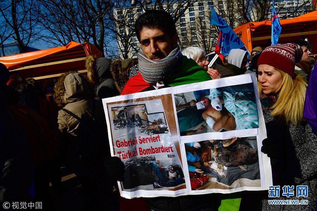 當(dāng)?shù)貢r間2018年3月3日,德國柏林,當(dāng)?shù)孛癖娕e行游行,抗議土耳其對敘利亞阿夫林地區(qū)的庫爾德人采取軍事行動。(圖片來源:視覺中國)