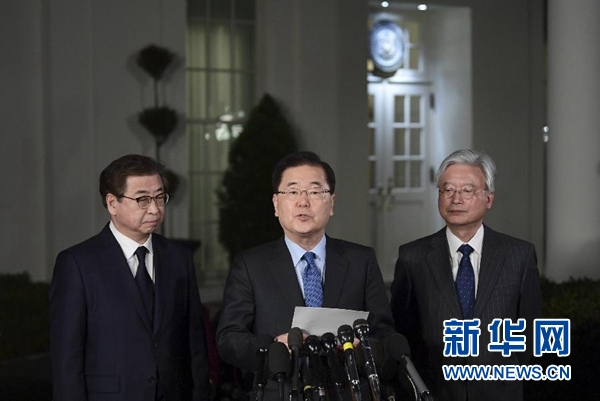 3月8日,正在美國(guó)訪問的韓國(guó)青瓦臺(tái)國(guó)家安保室室長(zhǎng)鄭義溶(中)在華盛頓白宮說,朝鮮最高領(lǐng)導(dǎo)人金正恩委托韓方向美方轉(zhuǎn)達(dá)他希望盡快與美國(guó)總統(tǒng)特朗普會(huì)面的意愿,特朗普已經(jīng)同意在5月之前與金正恩會(huì)面。新華社/美聯(lián)