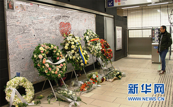 3月22日,在比利時(shí)布魯塞爾的馬埃勒貝克地鐵站,民眾自發(fā)為遇難者獻(xiàn)花。新華社記者 潘革平 攝
