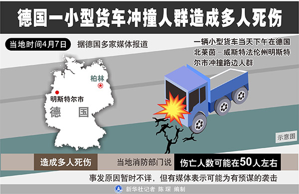 新華社柏林4月7日電(記者袁帥 沈忠浩)據(jù)德國(guó)多家媒體7日?qǐng)?bào)道,一輛小型貨車當(dāng)天下午在德國(guó)西部北萊茵-威斯特法倫州明斯特爾市沖撞路邊人群,造成多人死傷。當(dāng)?shù)叵啦块T說,傷亡人數(shù)可能在50人左右。