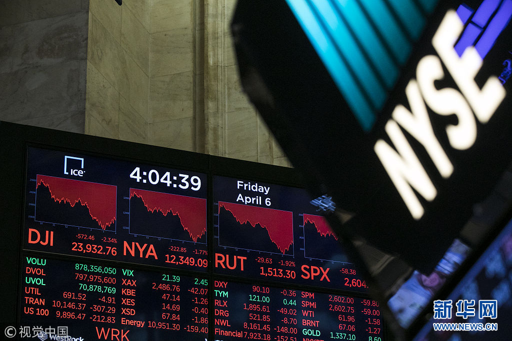 4月6日,美國紐約,紐約證交所。對中美貿(mào)易摩擦升級的擔(dān)憂6日彌漫華爾街,美股今天再度走低。道瓊斯工業(yè)指數(shù)當(dāng)天一度下挫接近800點。當(dāng)天,紐約股市三大股指全部收跌。道指報收于23932.76點,跌2.34%;標(biāo)準(zhǔn)普爾500指數(shù)收于2604.47點,跌2.19%;納斯達(dá)克綜合指數(shù)收于6915.11點,跌2.28%。(圖片來源:視覺中國)
