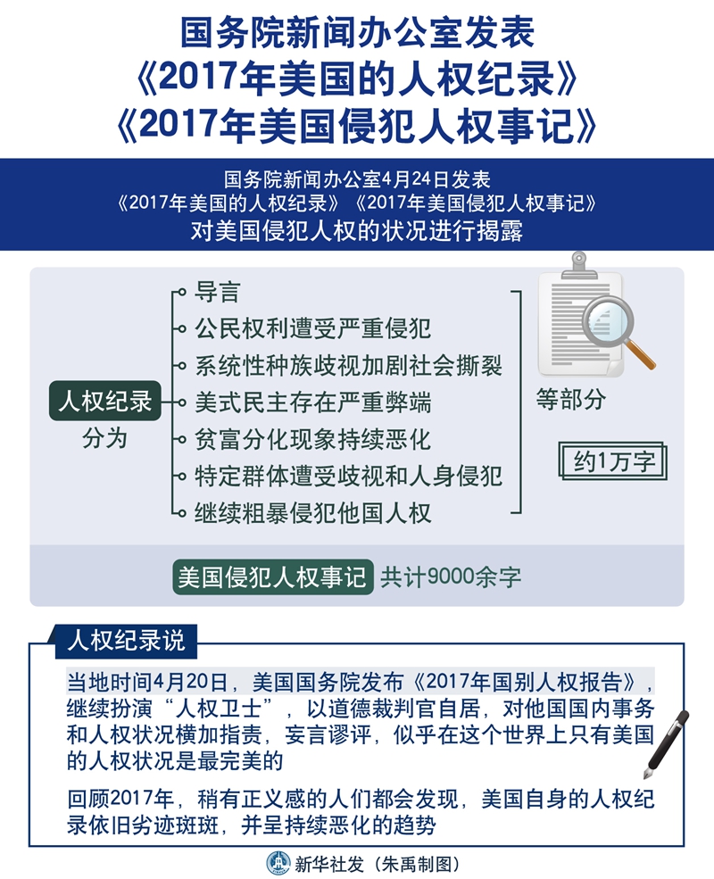 圖表:國(guó)務(wù)院新聞辦公室發(fā)表《2017年美國(guó)的人權(quán)紀(jì)錄》《2017年美國(guó)侵犯人權(quán)事記》 新華社發(fā)朱禹 制圖