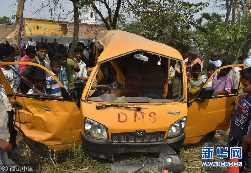 當(dāng)?shù)貢r(shí)間2018年4月26日,一輛載有22名兒童的校車在印度北方邦庫(kù)新加同一輛火車相撞,事故造成13名兒童死亡,8人傷勢(shì)嚴(yán)重。(圖片來源:視覺中國(guó))