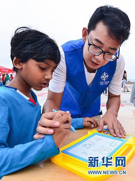 5月4日,在馬爾代夫首都馬累市中心停機(jī)坪廣場(chǎng),中國志愿者教當(dāng)?shù)貎和瘜憹h字。新華社發(fā)(杜才良 攝)