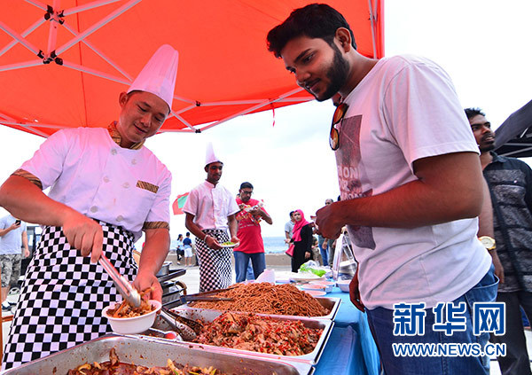 5月4日,在馬爾代夫首都馬累市中心停機(jī)坪廣場(chǎng),一名當(dāng)?shù)啬凶樱ㄓ遥┢穱L中國美食。 新華社發(fā)(杜才良 攝)