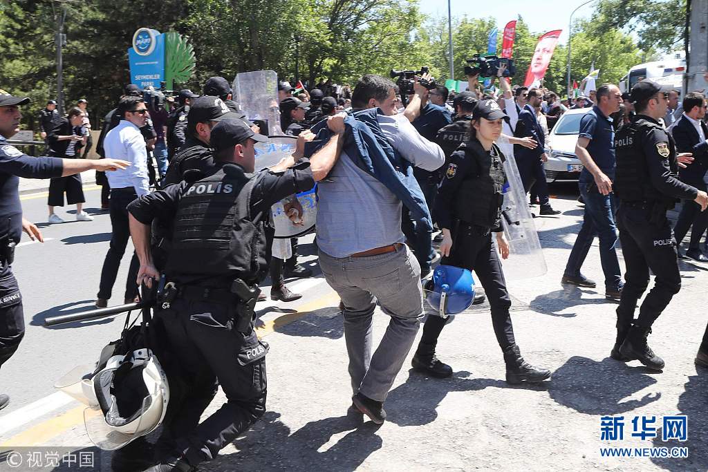 5月15日,土耳其安卡拉,示威者在以色列領(lǐng)事館附近投擲雞蛋和石塊,抗議美國(guó)駐以色列使館遷至耶路撒冷。(圖片來(lái)源:視覺(jué)中國(guó))