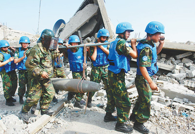 截至目前,中國赴黎巴嫩工兵分隊發(fā)現(xiàn)、排除地雷和未爆物9719枚,并完成大量營房、設(shè)備的維修任務。