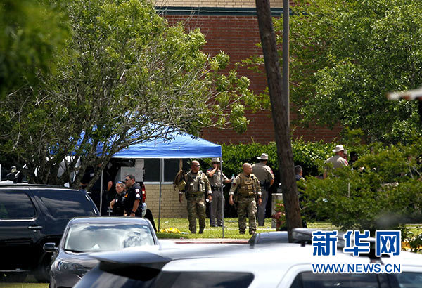 5月18日,在美國(guó)得克薩斯州加爾維斯頓郡圣菲市,安全人員在發(fā)生槍擊的圣菲高中周?chē)?。新華社發(fā)(宋穹 攝)