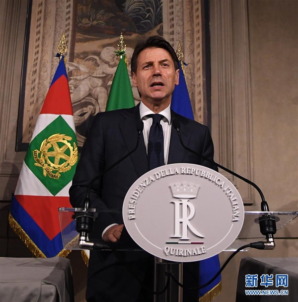 5月27日,在意大利首都羅馬,意新任總理孔特發(fā)表講話。據(jù)當(dāng)?shù)孛襟w報(bào)道,孔特27日晚間與總統(tǒng)馬塔雷拉會(huì)面并提交擬定的內(nèi)閣成員名單時(shí),馬塔雷拉否決了由意大利聯(lián)盟黨和五星運(yùn)動(dòng)力推的持疑歐立場(chǎng)的經(jīng)濟(jì)學(xué)家保羅·薩沃納出任財(cái)政部長(zhǎng)。孔特向總統(tǒng)提出放棄組閣任務(wù)請(qǐng)求,請(qǐng)求得到總統(tǒng)確認(rèn)。新華社發(fā)(阿爾貝托·林格里亞攝)