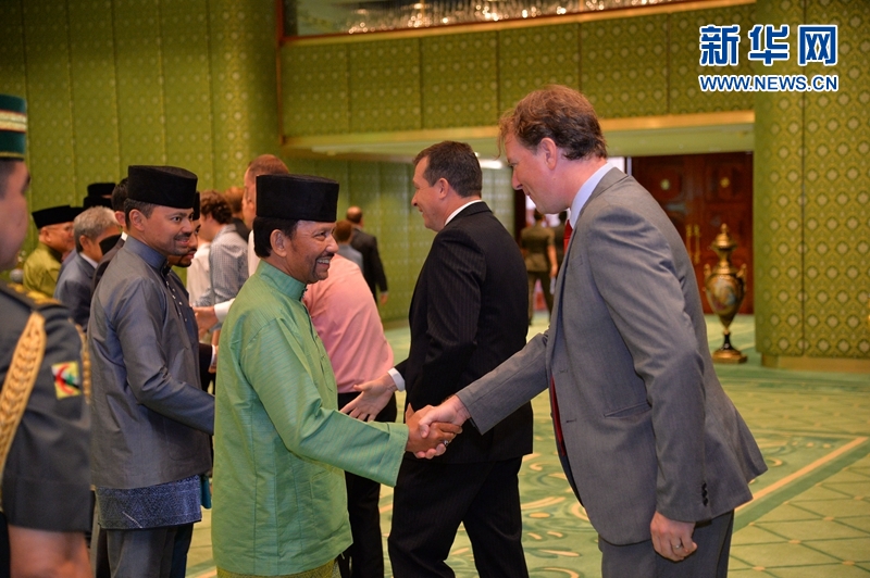 文萊蘇丹哈桑納爾·博爾基亞16日在努洛伊曼王宮與一名外國駐文萊外交官握手致意。新華網(wǎng)發(fā) 杰弗里·黃攝