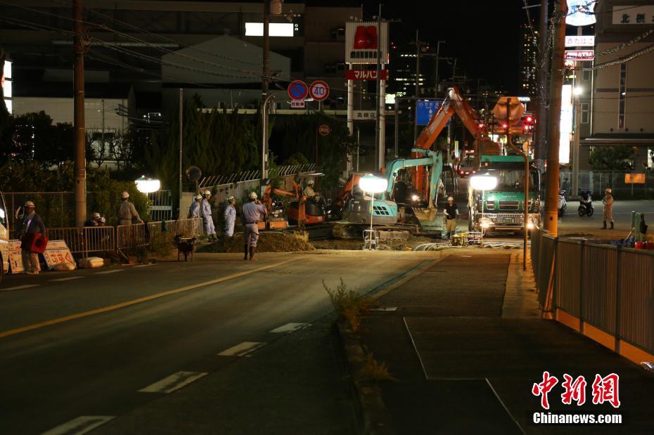 6月18日,日本大阪府發(fā)生6.1級地震。圖為位于震源附近的高槻市一處路面出現(xiàn)凹陷,相關部門正連夜進行搶修。中新社記者 呂少威 攝
