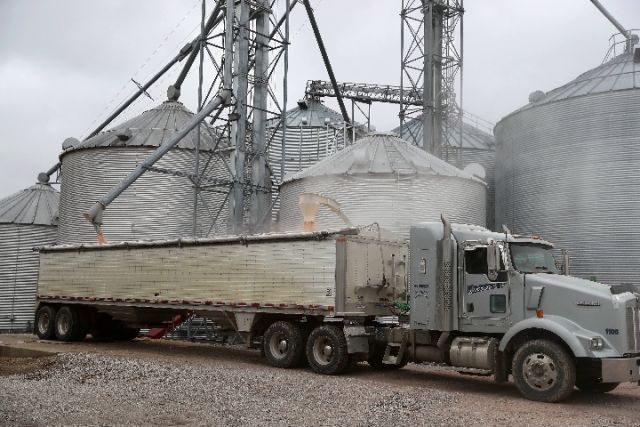 3月27日,在美國艾奧瓦州得梅因的金伯利農(nóng)場,卡車從糧倉裝載糧食。(新華社記者汪平攝)