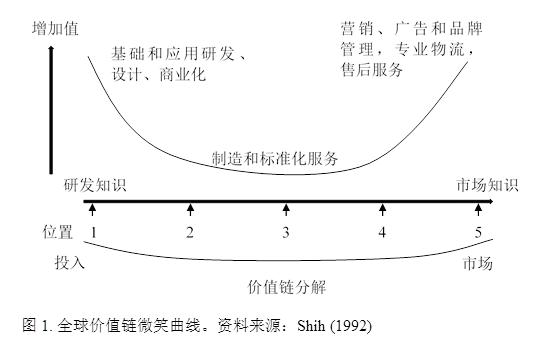 全球價值鏈構(gòu)建了一個跨國或者跨地區(qū)不同公司實現(xiàn)不同的工序和商業(yè)功能的生產(chǎn)架構(gòu)(Grossman和Rossi-Hansberg,2012)。這個架構(gòu)是“生產(chǎn)性的(價值增長的)通向并且支持最終使用的順序” (Sturgeon 2001)。微笑曲線提出了一種不同的解構(gòu)國際貿(mào)易的方法。有些國家專業(yè)化“生產(chǎn)”知識與研發(fā),而另一些國家專業(yè)化于制造業(yè),或者品牌營銷。因此,一個產(chǎn)品的增加值不再是完全屬于某一個國家,而是整條價值鏈上的參與者都可以分一杯羹。在為最終產(chǎn)品貢獻價值的生產(chǎn)工序的鏈條上(既,產(chǎn)品的價值鏈),一般的工序鏈條開始于基礎和應用研究與設計。這些研究與設計活動往往會帶來新的想法、技術(shù)、新產(chǎn)品設計和新的生產(chǎn)工藝。這個工序鏈條下一環(huán)節(jié)是商業(yè)化這些研究成果,如專利和知識產(chǎn)權(quán)(想法、論文、知識等);再下一環(huán)節(jié)是資源的獲取和材料的生產(chǎn)(包括農(nóng)業(yè)產(chǎn)品),零部件的生產(chǎn)和產(chǎn)品的組裝,以及最后環(huán)節(jié)的營銷、廣告、品牌管理、物流、商業(yè)服務和售后服務。另外,價值鏈在文獻中的定義是超出中間品貿(mào)易的,它強調(diào)在不同環(huán)節(jié)上領(lǐng)先企業(yè)與供應商之間的權(quán)力架構(gòu) (Milberg,2004)。