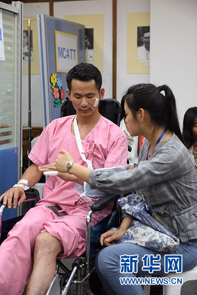 7月9日,在泰國普吉島的哇集拉醫(yī)院,一名華人志愿者(右)指導中國受傷游客活動手指關(guān)節(jié)。新華社記者 秦晴 攝