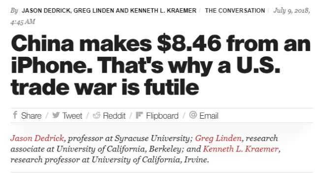 他們給出的理由則既簡單又引人矚目:“因?yàn)橹袊砍隹谝粋€(gè)iPhone給美國,只收入8.46美元”。