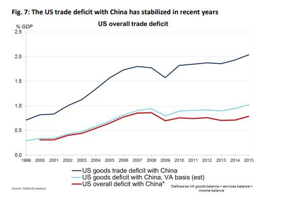 別看這個(gè)歐洲智庫的數(shù)據(jù)有點(diǎn)舊,在2018年的今天,情況還是一樣一樣的。美國CNBC上個(gè)月的一篇報(bào)道中就引用了來自牛津大學(xué)的數(shù)據(jù)稱,如果按照各國實(shí)際在貿(mào)易中的“附加價(jià)值”計(jì)算,中美現(xiàn)在3700億的貿(mào)易逆差會縮小一半之巨,即從美國GDP的2%縮小到1%——這已經(jīng)與歐盟相當(dāng)了。