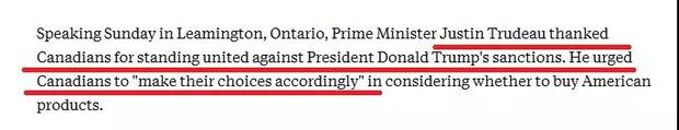 第三,大是大非上一定要團結一致。一說到團結,有的人總會聯(lián)想過于豐富:要么認為這是要老百姓放棄自己的思考,要么認為必須通過極端方式表達自己洶涌的激情——我們印象里一向溫和的加拿大,這次是怎么做的?用美聯(lián)社報道的話:特魯多在利明頓市演講時表示:感謝加拿大民眾團結一致反對特朗普的制裁,并鼓勵民眾根據(jù)自己的實際情況做出要不要買美國產(chǎn)品的選擇。特魯多為什么這樣說?事實上,自從G7之后特朗普攻擊特魯多“軟弱”“虛偽”以來,推特上“購買加拿大產(chǎn)品”“抵制美國貨”“抵制美國”“擺脫川普”等話題就在不斷升溫,很多加拿大人調(diào)整了消費習慣,轉(zhuǎn)而購買自己國家的產(chǎn)品。網(wǎng)友們的這些抵制活動,被特魯多稱為是一股“愛國熱情”。