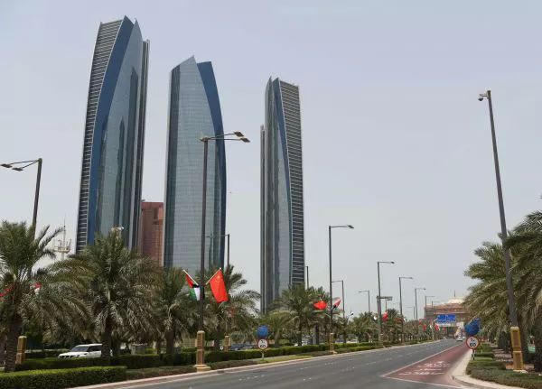 7月18日,阿聯(lián)酋首都阿布扎比的街道兩邊懸掛著中阿兩國(guó)國(guó)旗。(鄔惠我攝)