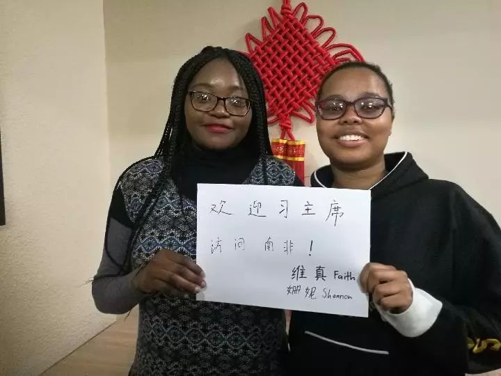 “雖然中文學起來很有挑戰(zhàn)性,但這也恰恰是吸引我的原因。”姍妮和同伴維真向記者驕傲地展示她們書寫的漢字:歡迎習主席訪問南非!