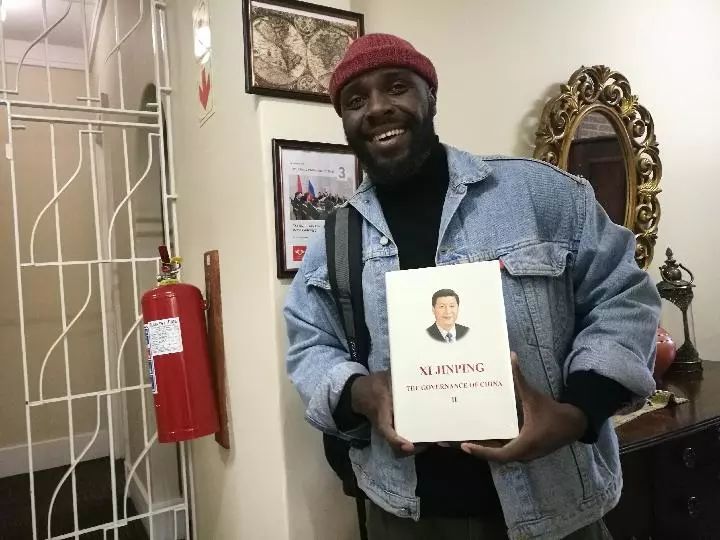 2018年7月20日,南非約翰內(nèi)斯堡大學孔子學院,學院職員邦加恩向記者展示剛從圖書室借到的《習近平談治國理政》(第二卷)英文版。(新華社記者劉衛(wèi)兵攝)