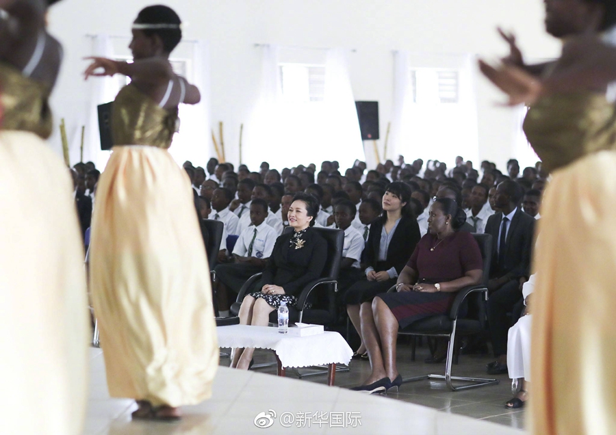 23日上午,國(guó)家主席習(xí)近平夫人彭麗媛參觀了盧旺達(dá)法維女子中學(xué)。全校師生聚集在學(xué)校大禮堂,歡迎中國(guó)貴賓到來(lái)。當(dāng)彭麗媛走進(jìn)會(huì)場(chǎng)時(shí),掌聲雷動(dòng)。同學(xué)們?yōu)榕睇愭鲁噬狭艘粓?chǎng)精彩演出:學(xué)校校歌合唱高亢激昂、中國(guó)經(jīng)典名曲《茉莉花》悠揚(yáng)嘹亮、盧旺達(dá)民族舞蹈熱情奔放。彭麗媛不斷為學(xué)生的出色表演鼓掌。演出結(jié)束后,彭麗媛向?qū)W校贈(zèng)送了一批教學(xué)用品,祝愿學(xué)校越來(lái)越好。一位同學(xué)向彭麗媛贈(zèng)送了一幅自己專門(mén)創(chuàng)作的畫(huà)像。彭麗媛高興地接過(guò)畫(huà)像大加稱贊,親吻這位同學(xué)的臉頰,并同她親切擁抱。彭麗媛對(duì)全校師生的熱情接待表示感謝。