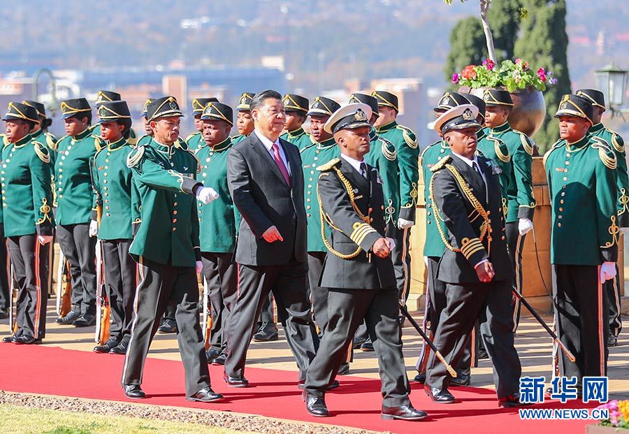 總統(tǒng)府前廣場(chǎng),微風(fēng)拂面,陽光和煦。中南兩國國旗迎風(fēng)飄揚(yáng)。習(xí)近平和夫人彭麗媛受到拉馬福薩和夫人莫采佩熱情迎接。兩國元首夫婦登上檢閱臺(tái)。儀仗隊(duì)行持槍禮。軍樂隊(duì)奏中國國歌。現(xiàn)場(chǎng)鳴放21響禮炮。習(xí)近平檢閱儀仗隊(duì)。軍樂隊(duì)奏南非國歌。習(xí)近平和彭麗媛同南方主要官員握手。拉馬福薩夫婦同中方陪同人員握手。兩國元首夫婦親切寒暄。拉馬福薩對(duì)習(xí)近平在南中建交20周年之際訪問南非并出席金磚國家領(lǐng)導(dǎo)人會(huì)晤表示熱烈歡迎。