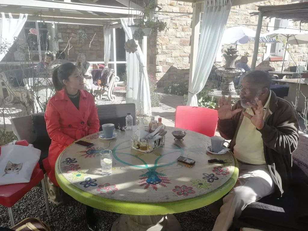 幾天的走訪過程中,比勒陀利亞市民對中國人的友好也給我們留下了深刻印象。走在街上,不時會有擦肩而過的當?shù)厝酥鲃酉蛭覀兇蛘泻?,用中文說著“你好!”照片中偶遇的這位當?shù)卮笫褰蠱agano。沒想到這位大叔還是位時事通,和我們聊起中國、金磚國家的時候,他顯得興致勃勃,不時做著手掌交叉、一拍即合的手勢。