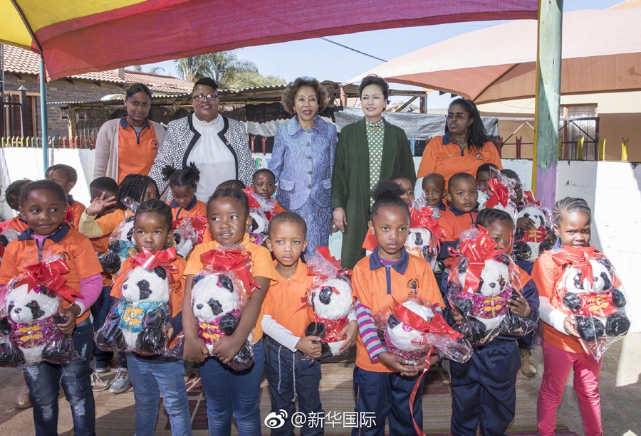 彭麗媛和莫采佩抵達(dá)時,非洲自助基金會負(fù)責(zé)人、托兒所園長等在門口迎接。40名活潑可愛的南非兒童揮舞中南兩國國旗列隊歡迎,彭麗媛俯身同孩子們親切握手問候。彭麗媛來到庭院,20多名兒童手持兩國國旗,輪流用中英文高聲呼喊“歡迎歡迎”。孩子們伴著俏皮輕快的舞蹈動作,合唱英文歌曲《歡迎您》、用中文吟唱中國古詩兒歌《詠鵝》、演唱南非說唱歌曲。彭麗媛認(rèn)真聆聽,頻頻點頭微笑、不時鼓掌稱贊,夸獎孩子們中文發(fā)音準(zhǔn)確。彭麗媛來到教室,觀看兒童繪畫、識字,和孩子們用當(dāng)?shù)貍鹘y(tǒng)手語互致問候。彭麗媛向孩子們贈送玩具、文具、圖書,并在孩子們自己創(chuàng)作的手印畫上題寫“前程似錦”,勉勵孩子們好好學(xué)習(xí)、茁壯成長。彭麗媛表示,兒童成長關(guān)乎一個國家未來。兒童早期教育,最重要的是樹德育人,引導(dǎo)他們樹立遠(yuǎn)大志向、培育美好心靈。希望中南友好事業(yè)從娃娃抓起,讓他們長大后做兩國友好事業(yè)的傳承者和接班人。