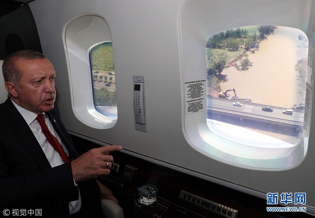 當(dāng)?shù)貢r(shí)間2018年8月11日,土耳其奧爾杜,土耳其總統(tǒng)埃爾多安乘直升機(jī)視察洪災(zāi)區(qū)。(圖片來(lái)源:視覺(jué)中國(guó))