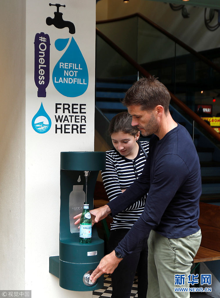 當(dāng)?shù)貢r(shí)間2018年8月28日,英國(guó)倫敦,民眾在公共飲水機(jī)旁飲水。倫敦市長(zhǎng)近日引進(jìn)了20個(gè)新的公共飲水機(jī),鼓勵(lì)人們自帶杯子取水喝,從而減少塑料垃圾。 (圖片來源:視覺中國(guó))