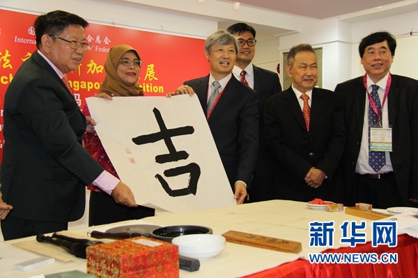 新加坡馬來族女總統(tǒng)哈莉瑪興致勃勃地揮毫書寫了漢字“吉”,并觀賞了書法家代表的現(xiàn)場書法表演。哈莉瑪在賀詞中說,中華書法是眾多新加坡人學習的傳統(tǒng)藝術(shù),新加坡書法家協(xié)會通過開設(shè)書法課程和舉辦揮春大會等方式,在新加坡多元文化背景下為加深跨文化交流做出了貢獻。此次國際書法交流大展展出的作品風格各異,無疑能帶動書法同道的藝術(shù)交流。