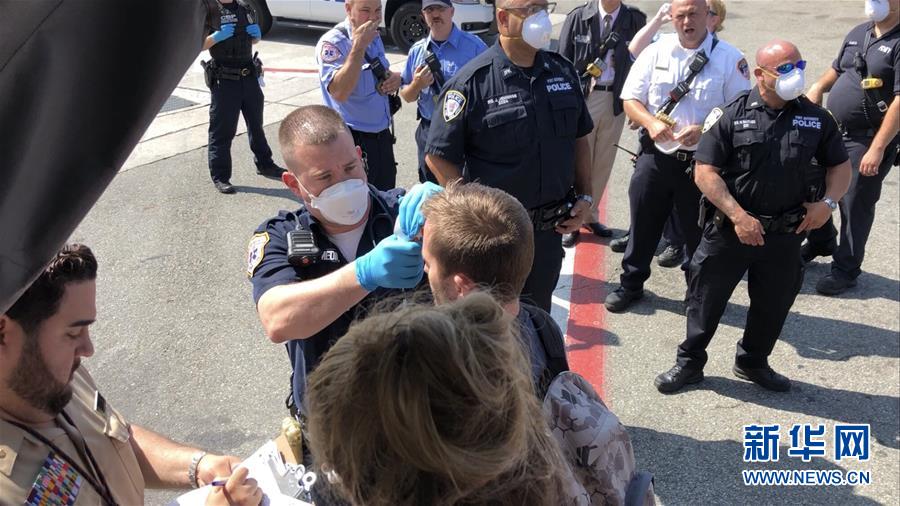 9月5日,在美國紐約肯尼迪機(jī)場,警察為阿聯(lián)酋航空公司EK203航班上的乘客查體溫。新華社發(fā)