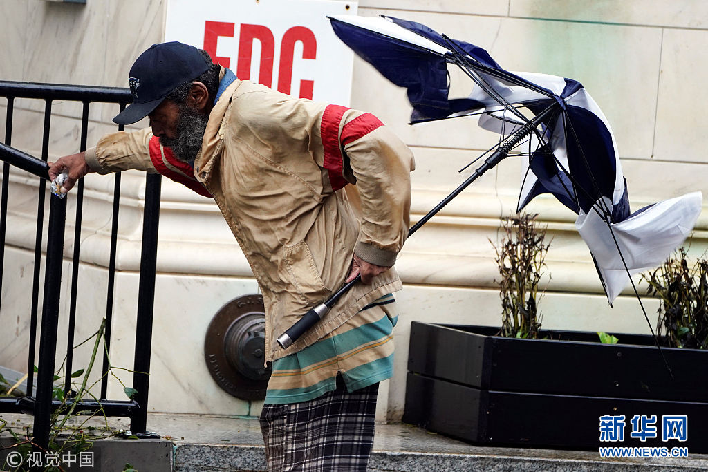 當(dāng)?shù)貢r(shí)間2018年9月15日,美國(guó)北卡羅來納州,颶風(fēng)“佛羅倫薩”在美國(guó)北卡羅來納州登陸,一名當(dāng)?shù)啬凶泳o握欄桿抵御狂風(fēng)。(圖片來源:視覺中國(guó))
