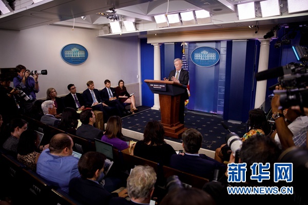 10月3日,在美國首都華盛頓,美國總統(tǒng)國家安全事務(wù)助理博爾頓出席記者會(huì)。 新華社發(fā)(沈霆攝)