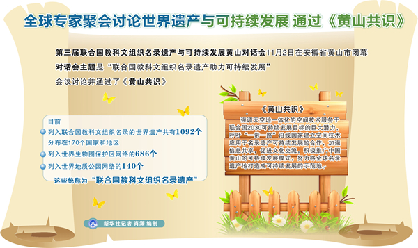 全球?qū)<揖蹠?huì)討論世界遺產(chǎn)與可持續(xù)發(fā)展 通過(guò)《黃山共識(shí)》 新華社記者 肖瀟 編制