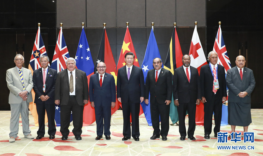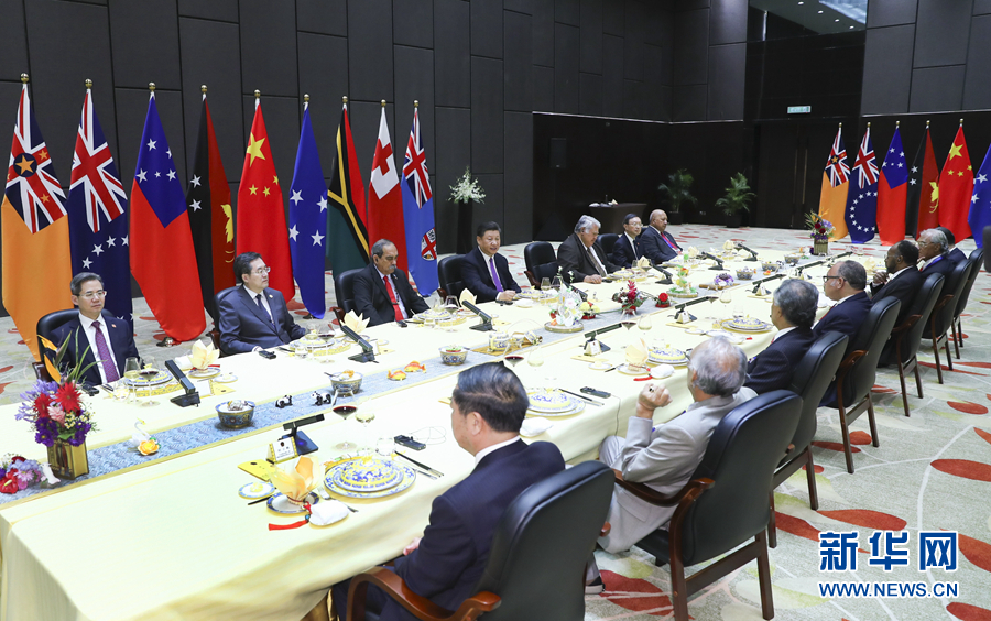 11月16日,國(guó)家主席習(xí)近平在莫爾茲比港同巴布亞新幾內(nèi)亞總理奧尼爾、密克羅尼西亞聯(lián)邦總統(tǒng)克里斯琴、薩摩亞總理圖伊拉埃帕、瓦努阿圖總理薩爾瓦伊、庫(kù)克群島總理普納、湯加首相波希瓦、紐埃總理塔拉吉等建交太平洋島國(guó)領(lǐng)導(dǎo)人以及斐濟(jì)政府代表、國(guó)防部長(zhǎng)昆布安博拉舉行集體會(huì)晤。習(xí)近平主持會(huì)晤并發(fā)表主旨講話。 新華社記者 謝環(huán)馳 攝
