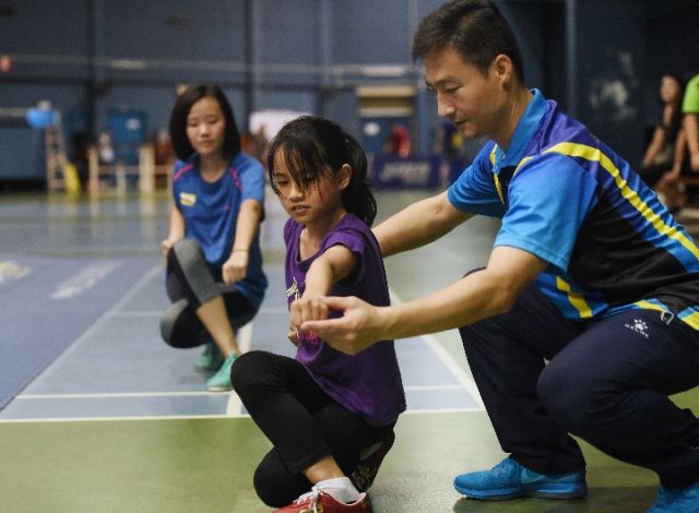 文萊國家武術隊教練李輝(右)在指導文萊學生武術動作。新華社記者王申攝