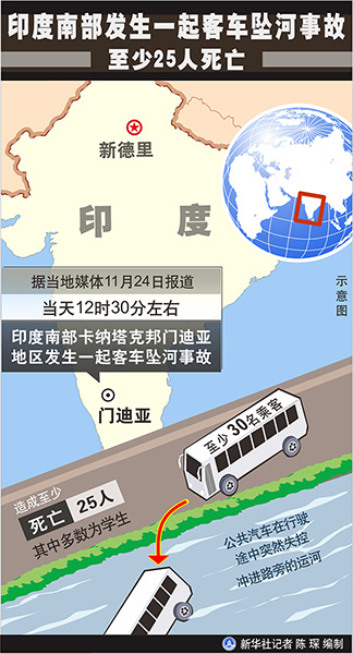 新華社新德里11月24日電(記者趙旭)印度南部卡納塔克邦門迪亞地區(qū)24日發(fā)生一起客車墜河事故,造成至少25人死亡,其中多數(shù)為學(xué)生。